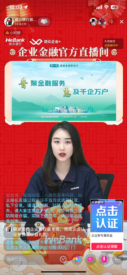 在深圳监管局指导下,微众银行微众企业+还借助丰富的线上媒体渠道及时与企业分享国家惠企政策,提升政策知晓度。此外,微众银行企业金融直播间是深圳市首个在银行设立的线上“金融驿站”,亦持续通过宣传和解读金融政策,推介普惠金融产品和服务,助力金融服务“不打烊”,满足中小微企业更多金融服务需求,助力政策精准落地。此外,微众企业+还通过线下LED大屏等扩大“普惠金融推进月”的影响力,充分营造金融惠企宣教氛围,宣传效果得到显著提升。