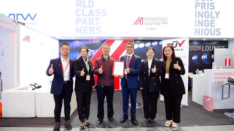 在2024国际橡塑展上,无锡首创总经理赵晓锋,TÜV奥地利中国区总裁黄飞、可持续发展总监刘涛等共同出席了颁证仪式。