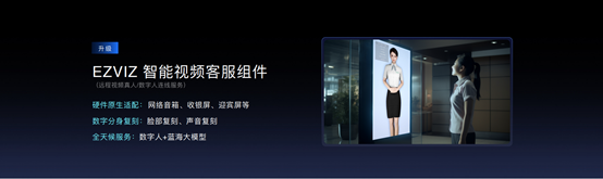 智能视频客服组件主要用于远程视频连线服务,通过蓝海大模型的数字分身复刻能力和大语言模型能力,可以实现全天候不间断的智能数字人连线服务,大幅降低人工投入成本。开发者还可以自行维护营销和服务语料,打造专属个性化服务。此外,萤石特别针对有屏幕的硬件进行了原生适配,以保障系统性能和呈现效果。该组件目前在零售、银行、医院、景区等场景中广泛应用落地,助力企业提升服务半径和深度。