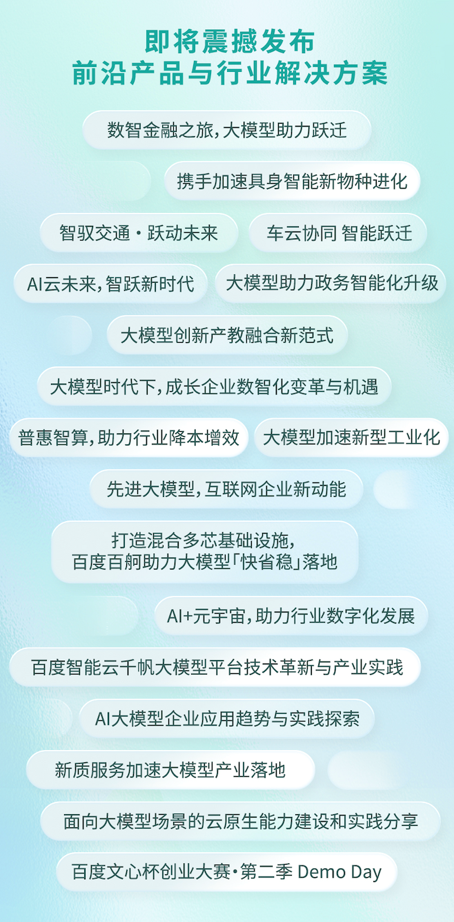 据悉,今年的百度云智大会以“智能·跃迁”为主题,百度智能云将对基础设施、大模型、开发工具链、AI原生应用等多个云与AI产品做最新发布,同时现场还将带来上百场专题演讲、多个行业解决方案和最新产品,以及上万平米的智能科技大展,实现规模、内容和体验三大维度重磅升级。亮点太多,先来划一波重点!