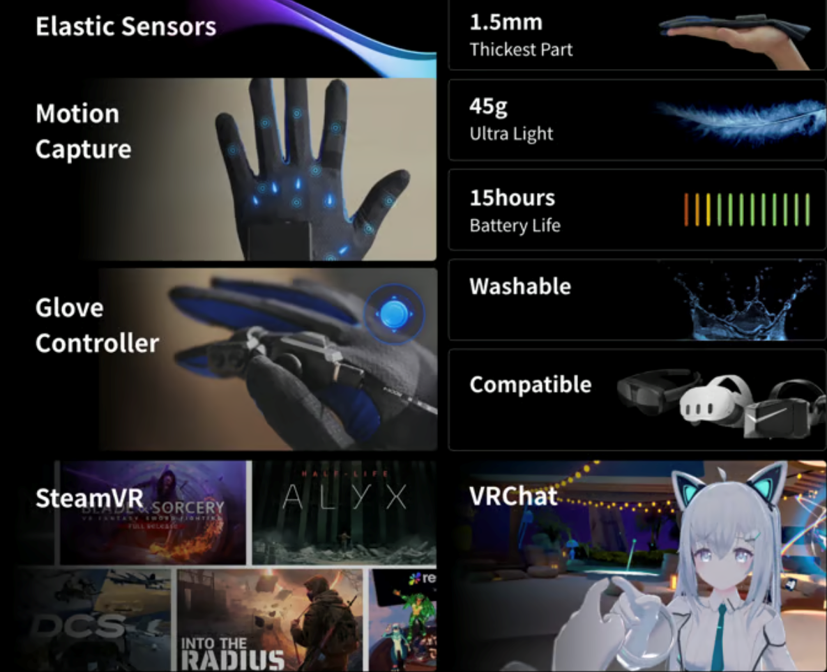 具体而言,每只手套内置的12个弹性传感器能够精准捕捉手部的15个关节,并提供21个关节角度数据,这使得用户在虚拟世界中的每一个手势都能做到自然流畅,提高使用VR设备的沉浸体验。更重要的是,手套还具备抗磁干扰和抗遮挡能力,即使在复杂的环境下,也能确保数据捕捉的精确性,保证高度真实的交互。