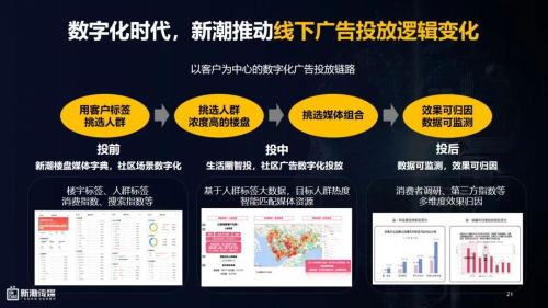 全面发力数字化,以数据力量加速“人货场”重构。新潮一直致力于线下媒体数字化技术开发,拥有100多项技术专利,依托包括京东在内线上平台建立了数字化广告投放全链路,以标签筛选、在线投放、效果归因等数字化手段,推动电梯媒体从“语文题时代”进阶到“数字题时代”,为品牌提供更好的营销解决方案。