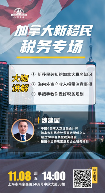 为了帮助新移民更好地应对税务挑战,我们特别邀请了精通中加跨境家庭及企业税务规划的中加双注册会计师魏建国先生,于11月8日再次莅临外联出国,手把手教新移民做好税务规划,向新生活平稳过渡。现场坐席有限先到先得,扫码即可报名。