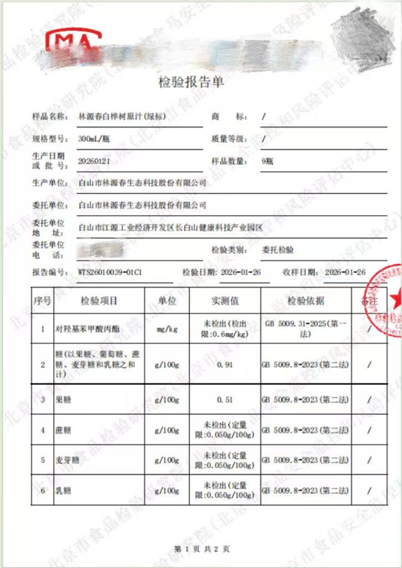 近日,网络上出现关于白山市林源春生态科技股份有限公司生产的桦树汁原汁产品检测出蔗糖及对羟基苯甲酸丙酯...