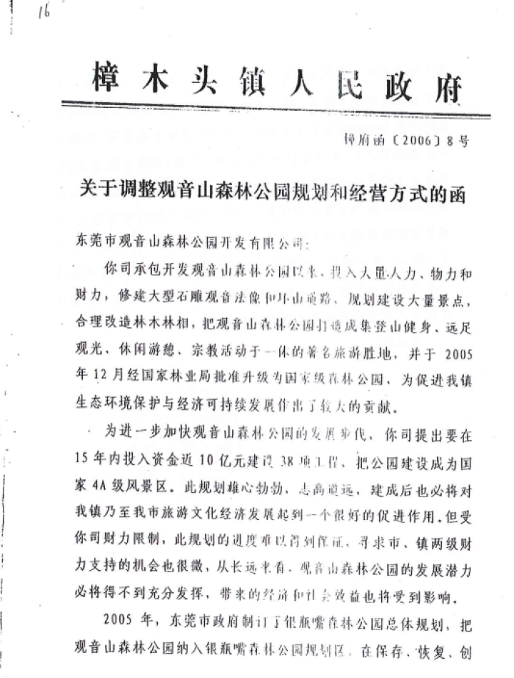 2006年初,以为了“把观音山森林公园做强做大”为由,樟木头镇、政府决定收回观音山森林公园的经营权,由镇政府担任投资主体和经营主体。为此,专门成立了观音山国家森林公园改造工作领导小组。