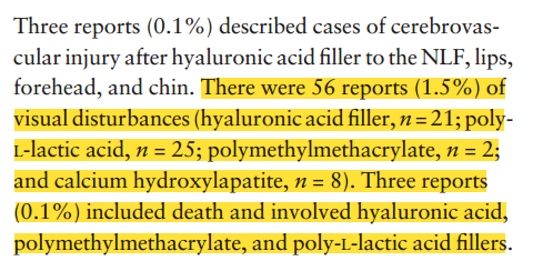 在FDA披露有56份报告(1.5%)涉及视力障碍(透明质酸填充剂,n=21;Sculptra,n=25(最多);聚甲基丙烯酸甲酯,n=2;羟基磷灰石钙,n = 8);有三份报告(0.1%)死亡,涉及玻尿酸、聚甲基丙烯酸甲酯和Sculptra。
