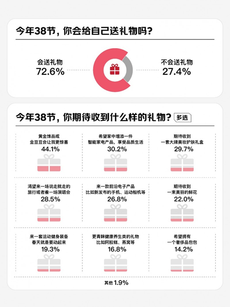越来越多的女性选择自我宠爱,在38节这个特殊节日为自己送上一份礼物。在调研中,72.6%的女性表示会在38节给自己送礼物,尤其00后新生代群体更愿意给自己送礼物,占比达89%。具体而言,黄金产品最受欢迎,44.1%的女性表示黄金饰品或金豆豆最令她们惊喜;其次有30.2%的女性希望家中添置一件智能家电产品,享受品质生活;大牌美妆护肤礼盒以29.7%的选项占比位列心愿清单第三,体现出女性对自我形象管理的持续关注。
