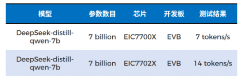 EIC7700X/7702X内嵌NPU、GPU、DSP等硬件加速模块,配备大容量、高带宽的LPDDR5内存,确保在处理DeepSeek大规模模型时能够充分利用硬件资源,快速搬运大模型参数,从而显著提升推理效率。测试结果如下图所示,在运行7b参数规模的DeepSeek-distill-qwen模型时,搭载奕斯伟计算EIC7700X芯片的EVB开发板可达7 tokens/s的推理速度,搭载奕斯伟计算EIC7702X芯片的EVB开发板可达14 tokens/s的推理速度,展现出远超同类架构的高能效比。