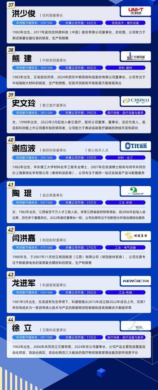和讯财经研究院发布《2025年中国科创新锐力量榜》,榜单列出了今年中国科创板上市公司45岁以下(80后)的青年领导者,并根据上市公司2025年一季度末市值(2025-3-21)进行排序。