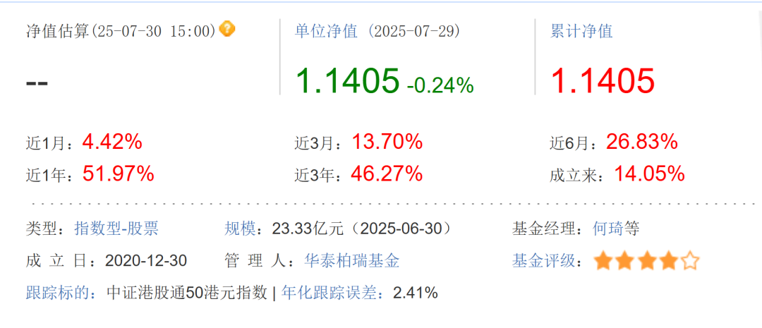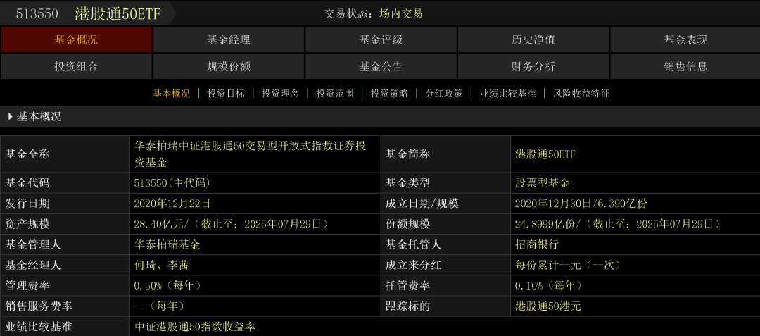 港股通50ETF(代码:513550)是市场首只跟踪港股通50指数的ETF,成立于2020年12月30日,由华泰柏瑞基金管理有限公司发行。