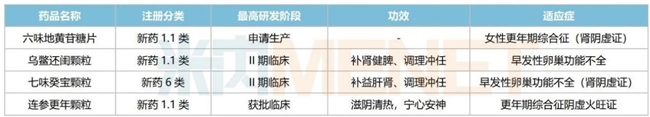 在研中药新药中,六味地黄苷糖片已于2025年3月提交NDA,用于治疗女性更年期综合征(肾阴虚证);乌鳖还闺颗粒、七味癸宝颗粒均已步入II期临床,均可用于治疗早发性卵巢功能不全。