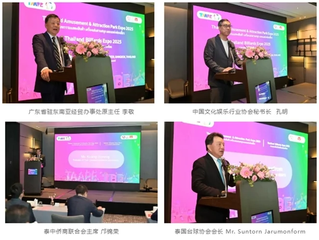 泰国旅游局(TAT)、中国文化娱乐行业协会(CCEA)、泰国会议展览局(TCEB)、马来西亚主题公园暨家庭娱乐协会(MATFA)、老挝台球协会、越南台球斯诺克协会、温州教玩具行业协会、泰国玩具与儿童产品贸易协会、泰国台球运动协会(BSAT)等政府机构及行业协会代表先后登台发言,高度肯定区域文旅体育产业合作的战略意义,表达对TAAPE与TBE展会的殷切期待与全力支持。