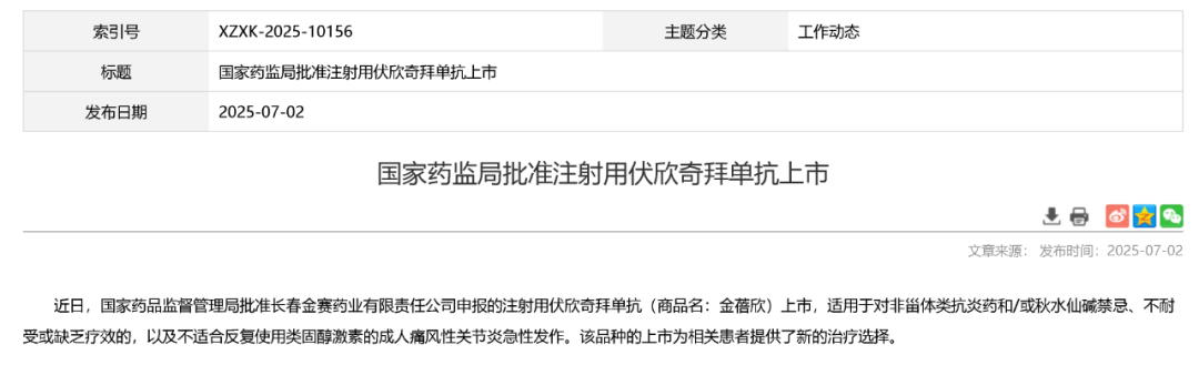 7月2日,国家药监局网站发布信息,长春高新的注射用伏欣奇拜单抗(金蓓欣)上市,用于痛风治疗。