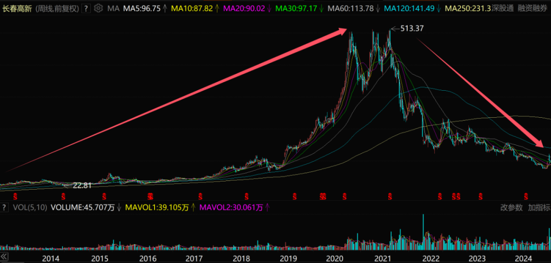 在这则长春高新13年翻100倍的故事不久之后,2021年5月17日,长春高新股价就见到历史大顶的513.37元,之后一路下跌,从一只涨幅几百倍的超级大牛股变成了彻头彻尾的“大熊股”,2024年9月,其股价一度跌破75元,4年多跌幅高达85%。
