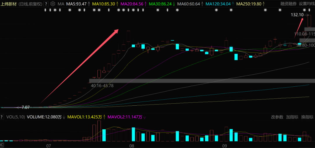 于是,9月24日、25日,上纬新材又是连续两个20cm大号涨停,再创历史新高,股价来到132.1元。