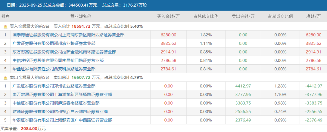 9月25日龙虎榜数据显示,买入榜前五席位中,有国泰海通证券上海浦东新区海阳西路、广发证券郑州农业路、华鑫证券西安科技路,四者分别净买入6280万元、3826万元、2785万元。此外,东方财富的“拉萨天团”净买入近2915万元。