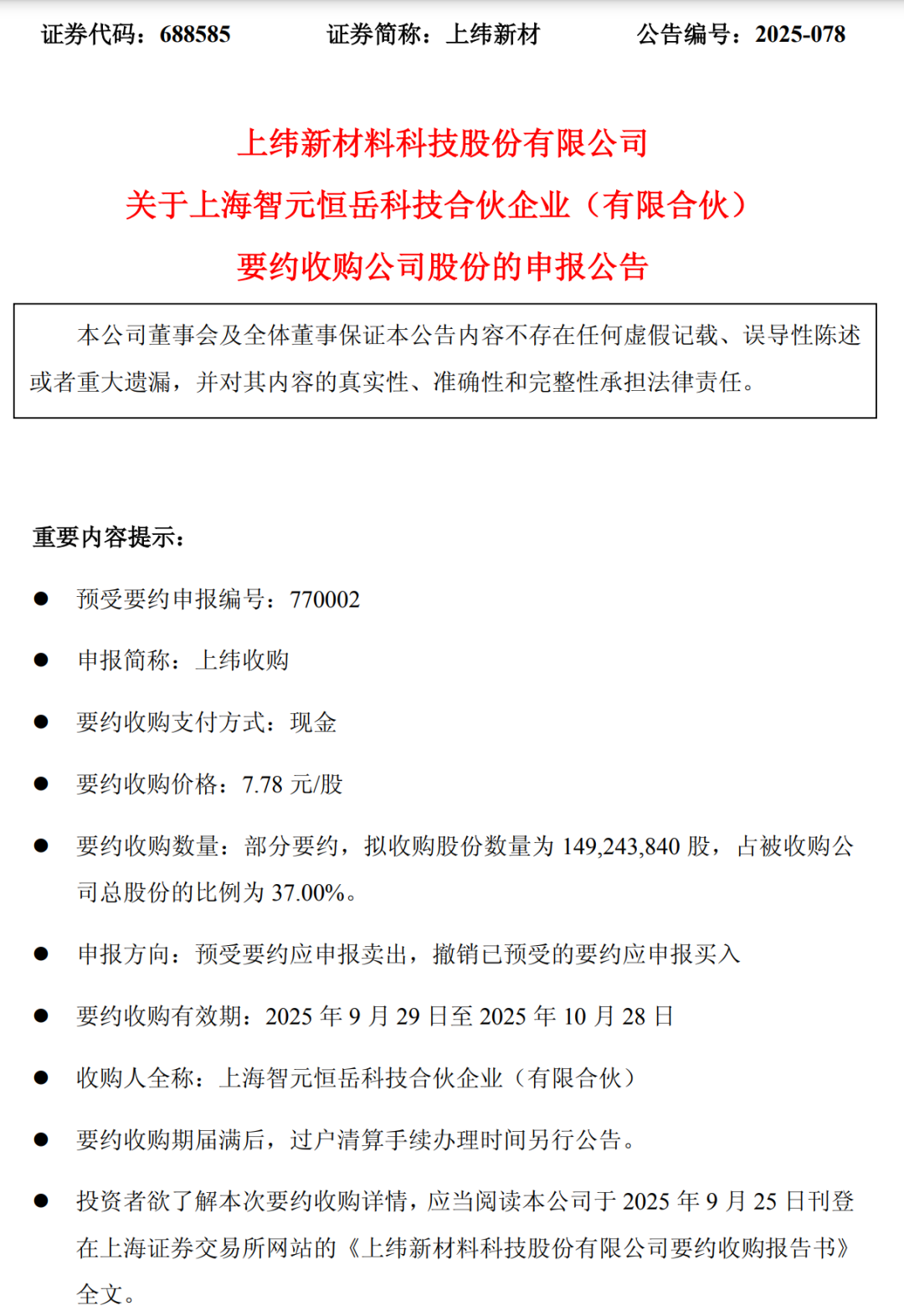 9月25日,上纬新材再曝大消息,公司发公告宣布智元恒岳拟收购上纬新材总股本的37%(1.49亿股),要约价格为7.78元/股,收购期限是2025年9月29日至10月28日(30个自然日)。