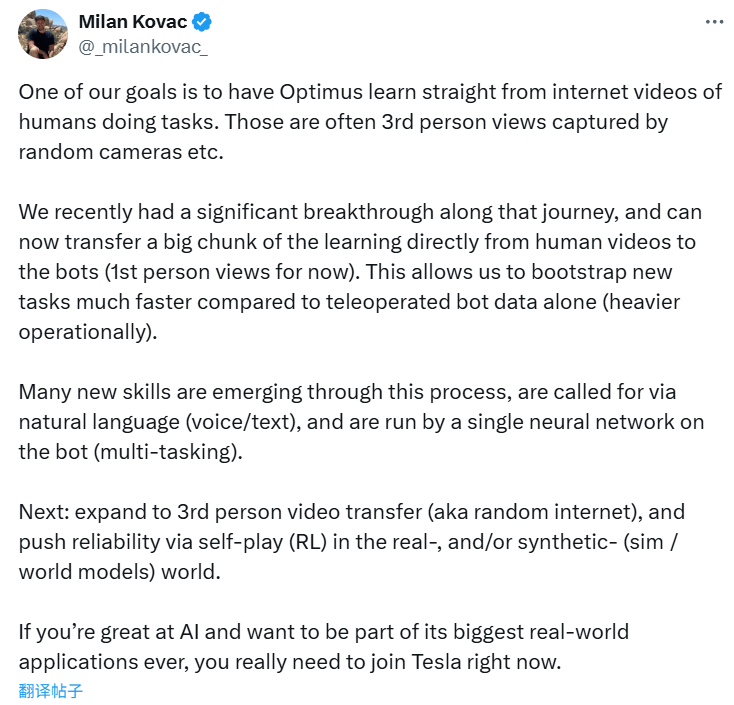 面对这一困境, 行业头部企业纷纷转向互联网视频这一潜力数据源 。今年5月,特斯拉工程主管Milan Kovac公开表示, Optimus将告别传统动作捕捉和远程操控,转向直接从互联网视频中学习 。互联网视频资源丰富、成本低廉,且蕴含着人类与物理世界交互的高维信息。如何将这些非结构化的2D视频数据,转化为机器人可理解、可执行的训练数据,成为技术突破的关键。