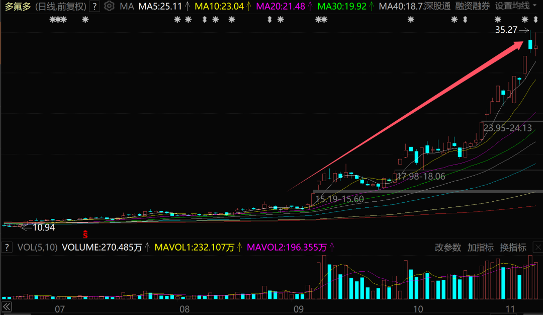 9月初以来,多氟多股价从13元附近涨到了35元以上,两个多月涨幅高达167%。