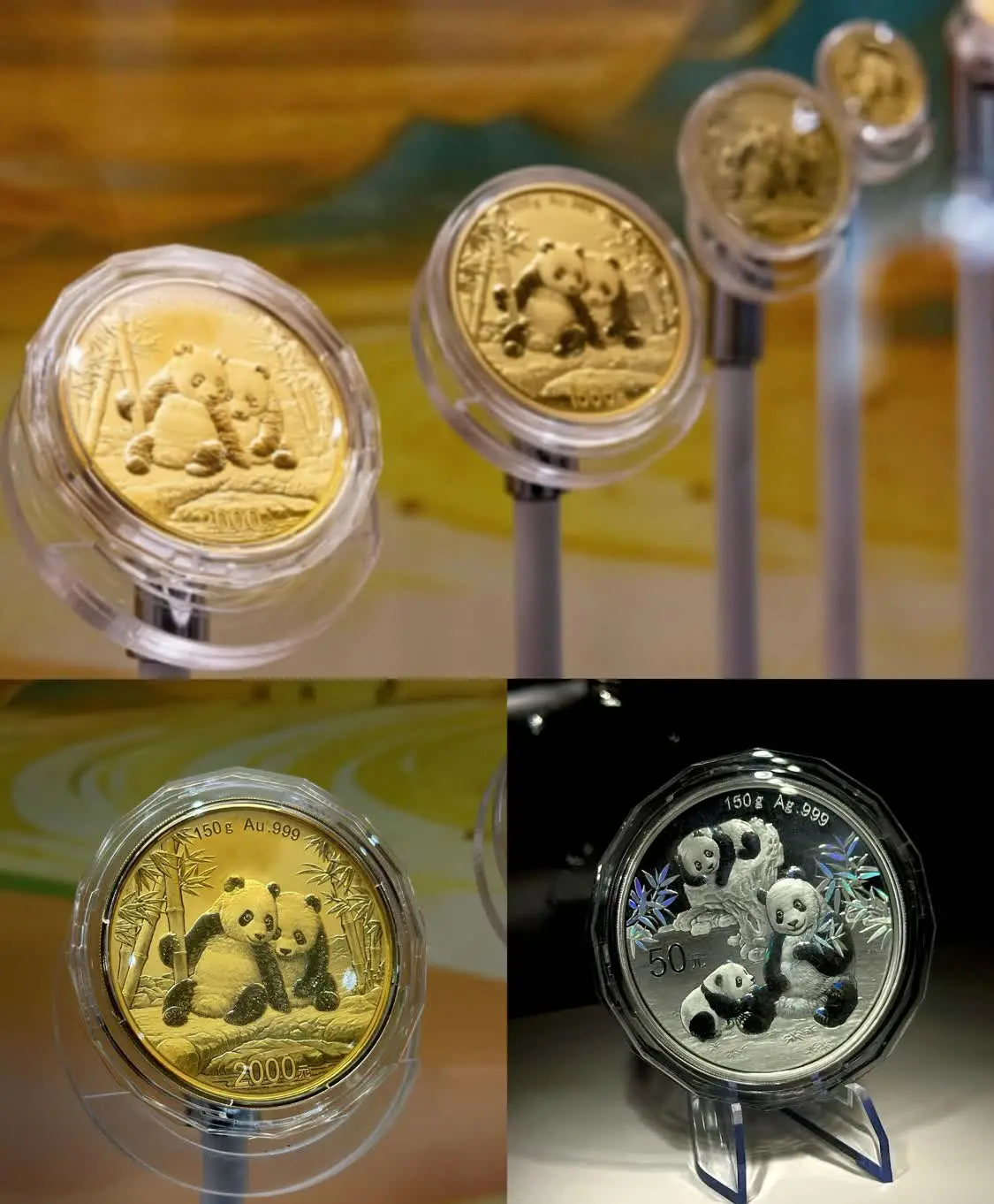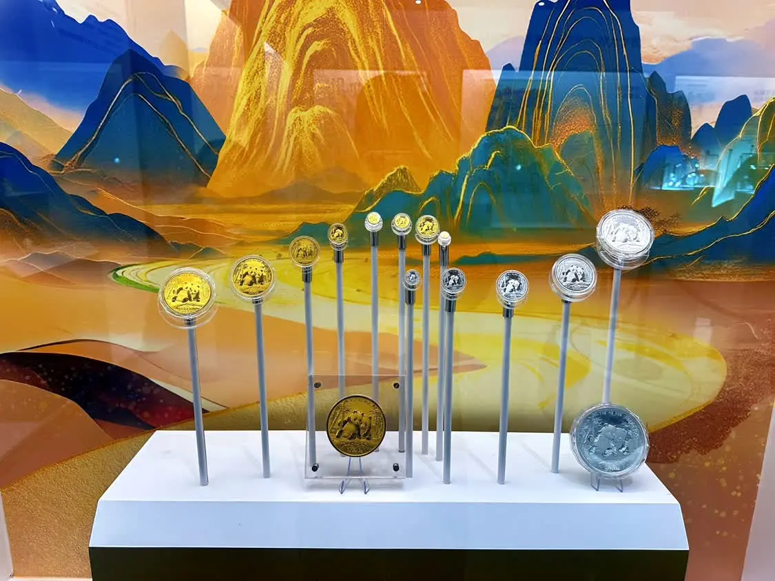 本次展览以“币载千年文明,熊猫传递友谊”为核心理念,融合中华货币文化、熊猫生态符号与现代金融理念,打造出一场贯通古今、连接中外的文化盛宴。展览分为“方寸大观·中华传统文化的全新载体”、“天府神韵·巴蜀文化的金银记忆”、“熊猫纪元·国宝的金色名片”三大主题展区,集中展示不同年份、不同主题的贵金属纪念币共一百余枚,包含从1982年到2025年发行的全部熊猫贵金属币以及最新发行的2026版熊猫贵金属币。这些贵金属纪念币不仅记录了熊猫憨态可掬的生动形象,更以精湛的雕刻与铸造工艺,展现了中国造币技术的高超水准,成为传递中华文明与友好往来的艺术载体,也进一步强化了熊猫金币在公众心中的“金色名片”形象,为提升品牌认知与情感联结奠定了坚实基础。