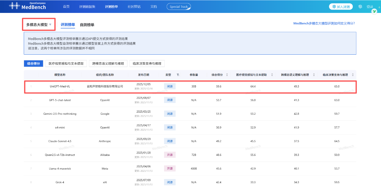 12月16日,中文医疗大模型权威评测平台MedBench4.0发布最新评测结果。云知声自主研发的“山海医疗大模型(UniGPT‑Med)”展现出全面领先的技术实力,一举斩获医疗智能体、医疗大语言模型、医疗多模态大模型三项技术范式,成为本次评测中表现最为突出的“三冠王”。