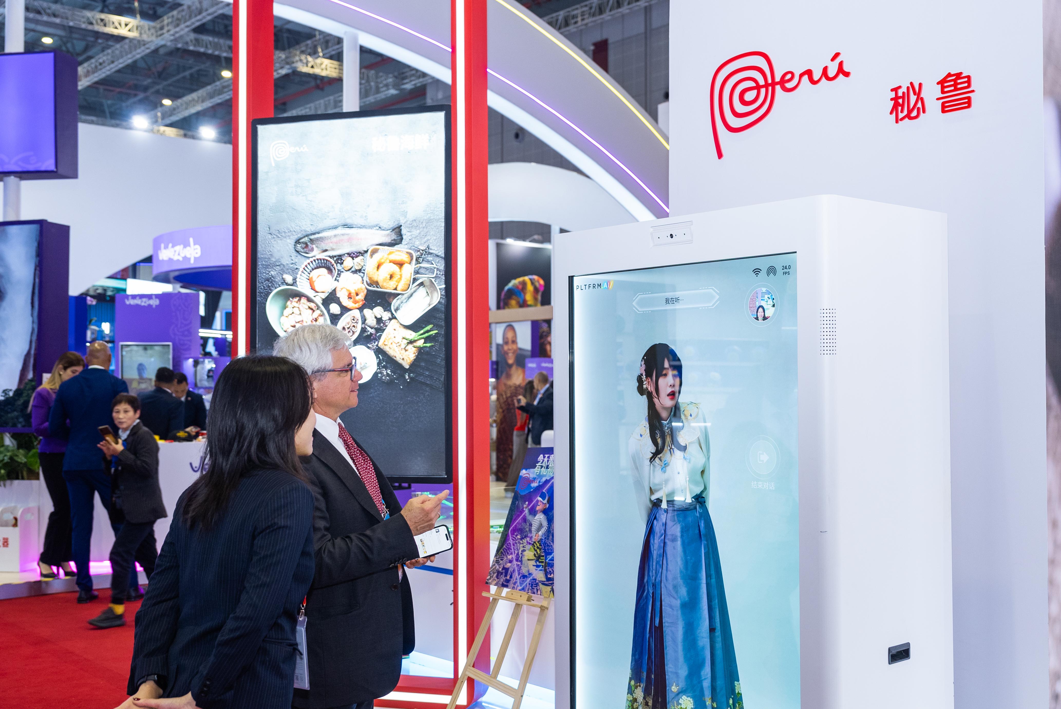 现场观众戴上 VR 眼镜,便可“瞬移”至安第斯山脉,沉浸式体验在云雾中俯瞰马丘比丘遗址,仿佛真正踏上了印加古道;而另一侧的AI数字人互动屏幕前,总是围着好奇的参观者——这是由 PLTFRM 打造的 AI 数字人,它能用流畅的中、英文双语与观众对话,回答从国家概况到自然景观、从历史遗迹到旅行路线规划等各种问题,让人们以更轻松、更即时的方式走近秘鲁。 通过这种虚实结合的展示方式,国家馆不仅让文化推介更加生动,也为秘鲁旅游在中国市场的传播打开了新的想象空间。数字技术与千年文明的交汇,使今年的秘鲁馆成为进博会现场最具沉浸感和科技感的“文化窗口”之一。