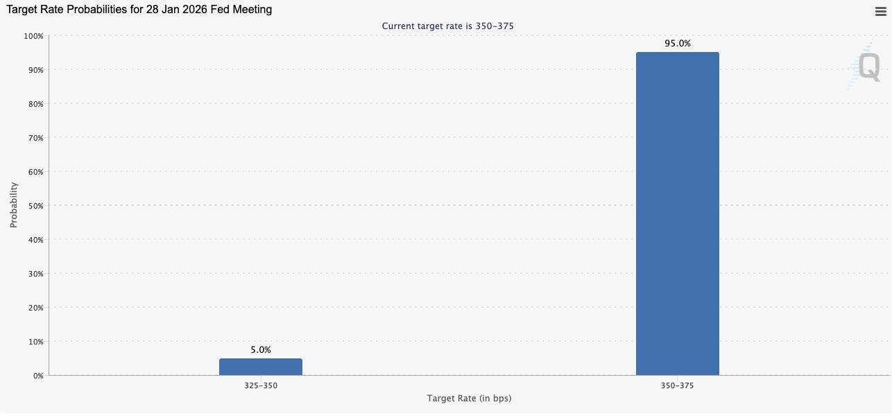 目前,我们正处于美联储1月27-28日议息会议前的“静默期”(Blackout Period),这意味着美联储官员在此期间不会发表任何公开评论。市场的定价机制因此完全依赖于近期公布的经济数据。根据预测市场的数据,交易员们押注美联储在1月会议上维持利率不变(Hold)的概率高达95%(截至1月20日2026年)。