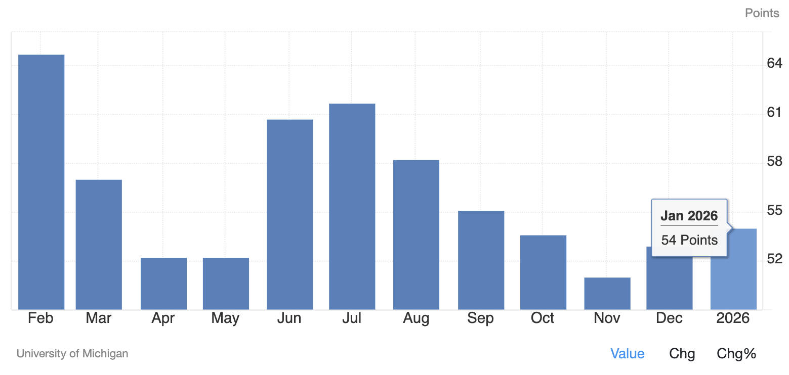 这种“销售额涨、销量跌”的现象是典型的高通胀特征。消费者正在支付更高的价格以获得更少的商品,这种由价格驱动而非需求驱动的增长是不可持续的。这也解释了为何密歇根大学消费者信心指数在2026年1月虽然微幅回升至54.0,但仍处于历史低位区间。消费者对于通胀的焦虑并未消散,尤其是低收入群体正在缩减非必要开支,这种K型复苏的特征对于依赖大众消费硬件(如智能手机、PC)的科技公司构成了潜在的营收压力。