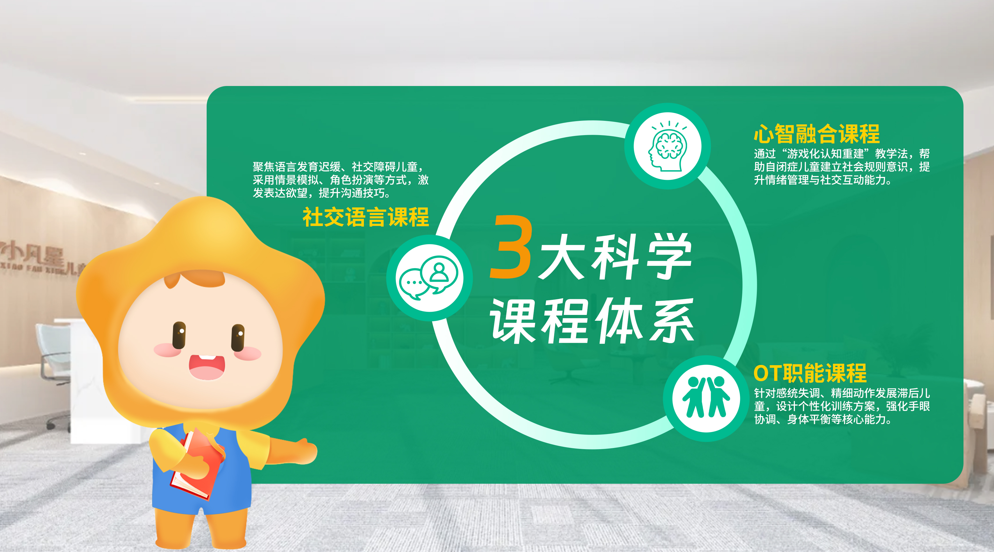 小凡星独创“心智融合+社交语言+OT职能”三阶课程体系,以“游戏化干预+动态评估”为核心,全方位解决特殊儿童认知、语言、运动等成长难题: