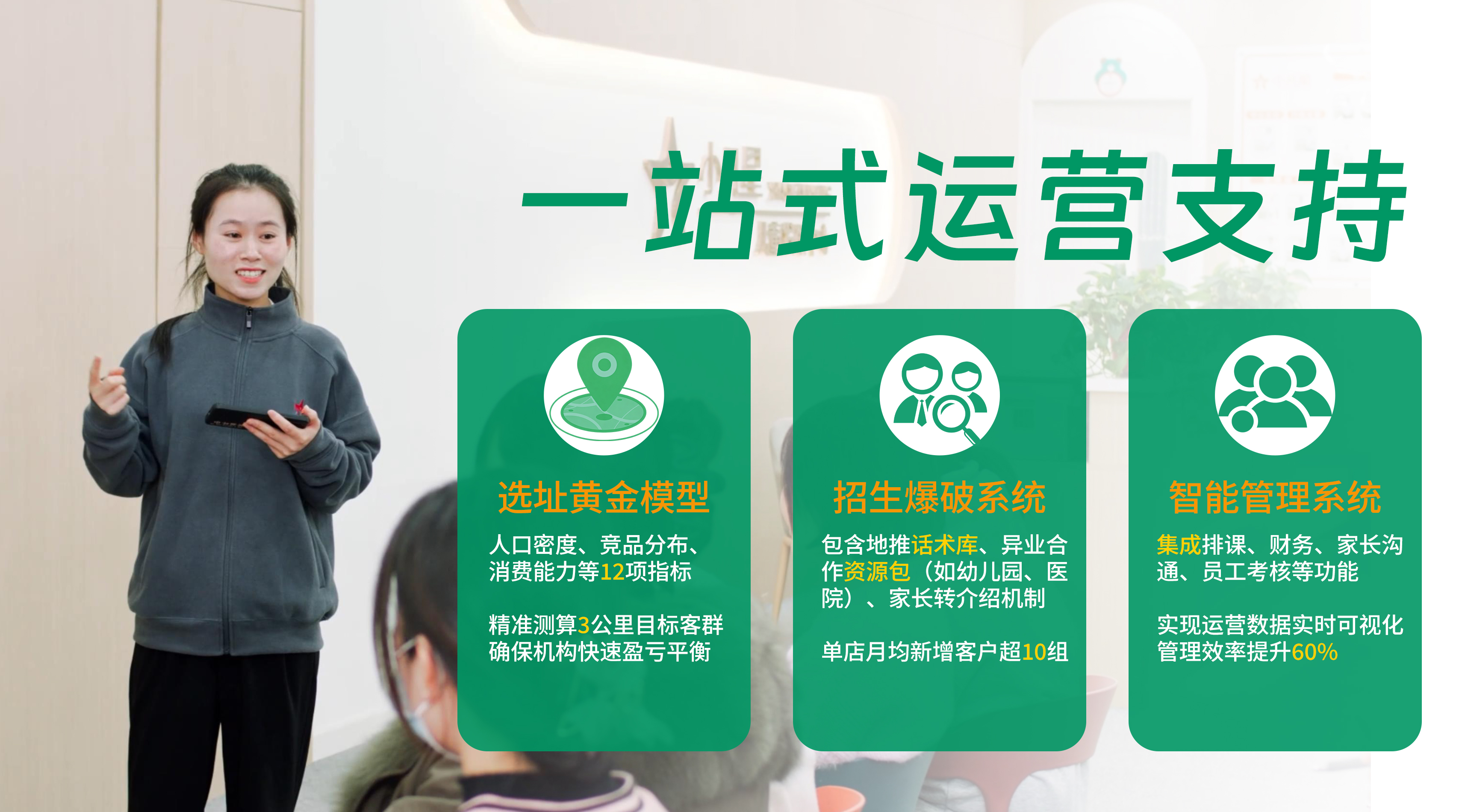 小凡星提供“选址-招生-管理”一站式运营支持,基于品牌100+家机构数据沉淀,降低加盟商试错成本: