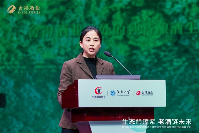 会上,舍得酒业技术研究院执行院长邹永芳从自然驱动与生物调控的双轮驱动,系统性阐述了舍得生态老酒形成的逻辑与科技赋能的作用。她表示,舍得酒业将进一步解析自然生态与酿酒微生态的关联机制,推动白酒生产从传统的经验控制向科学精准控制转变。