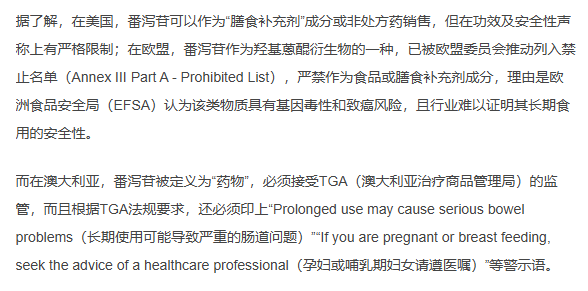据有关记者报道,本次被清退的多为国内品牌,但在淘宝、京东等主流平台上,含番泻苷相关成分的跨境膳食补充剂依然热销,部分链接销量显示“全网10万+人付款”。这些在海外受到严格监管的产品,得以在国内披上“天然”“植物提取”的外衣流通,关键原因在于各国监管标准不一。欧盟禁止番泻苷作为食品成分,认定其具有基因毒性及致癌风险;澳大利亚将其列为药物,要求标注健康警示;美国虽允许使用,但设定了严格的功效限制。不法商家利用跨境监管的灰色地带,一方面宣称产品“符合出口国标准”,甚至标注“0番泻叶”,另一方面却在英文成分表中暗藏相关提取物。加之跨境产品溯源困难、多部门协同监管存在壁垒,使得这一领域成为违规产品的“避风港”。