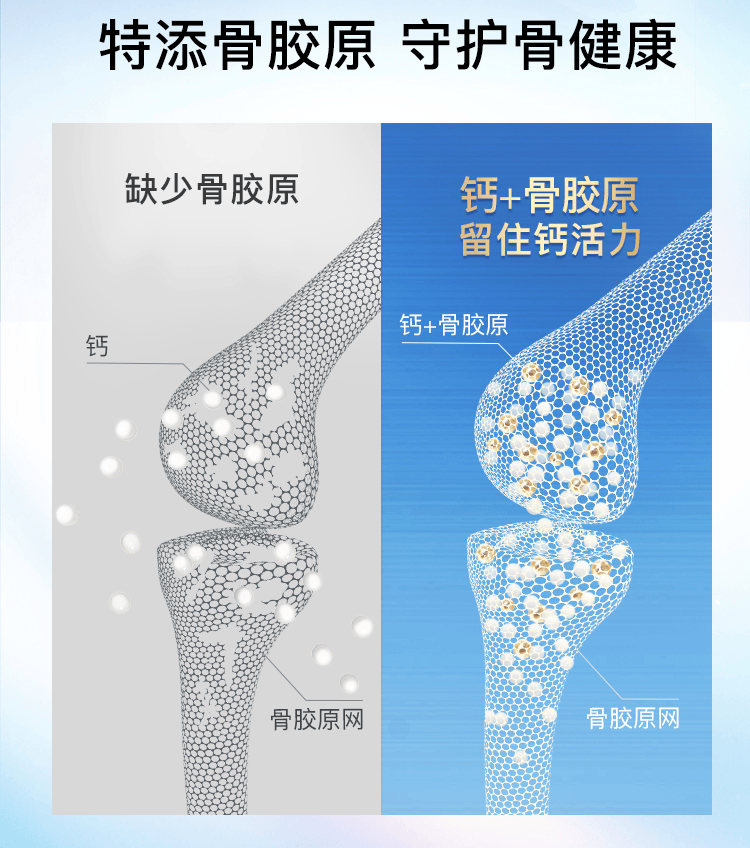 科学补钙链路应为:钙+骨胶原+维生素D3+维生素K2。D3促进钙在肠道吸收,K2引导钙沉积入骨,骨胶原负责“锁钙固骨”,四效协同,养护效果更全面。