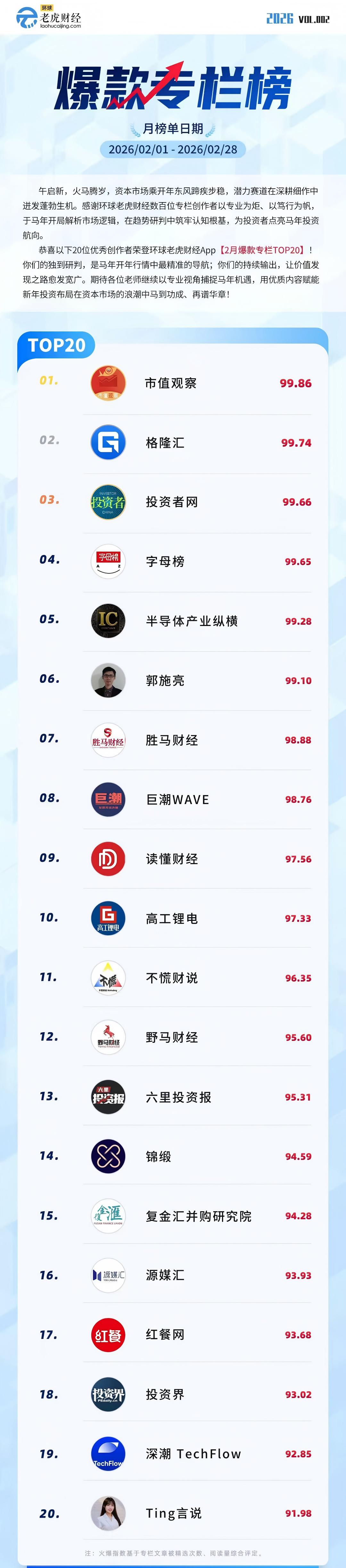 2026-03-02 11:18:05 来源:信阳新闻网 作者: 摘要:在2026环球老虎财经月榜中,华商韬略子账号市值观察成功上榜,位列第一。