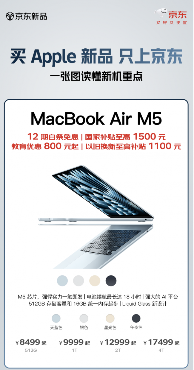 在存储配置上,搭载M5芯片的新款MacBook Air迎来重磅升级,采用速度更快的固态硬盘技术,起步存储容量较上代机型翻倍,达512GB,最高可选配4TB,为重要任务留出充足空间。外观设计上,新品采用轻薄耐用的精美铝金属机身设计,配备绚丽的Liquid视网膜显示屏和 1200万像素Center Stage摄像头,电池续航时间最长可达18小时,并配有支持空间音频的沉浸式音响系统。