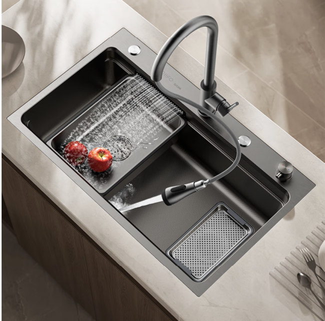 在日丰卫浴工厂,“日丰瀑布水槽”正源源不断下线。这款由京东与日丰联合打造的爆款单品,已成为国货水槽的标杆之作。产品采用双导轨设计,实现洗、切、沥一体化操作;表面应用纳米涂层技术,有效抵御剐蹭划痕,兼顾实用与美观。