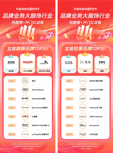 抖音电商双11品牌&店铺热卖榜发布,揭晓2024年抖音电商双11服饰、快消、耐消三大行业的热卖商家名...